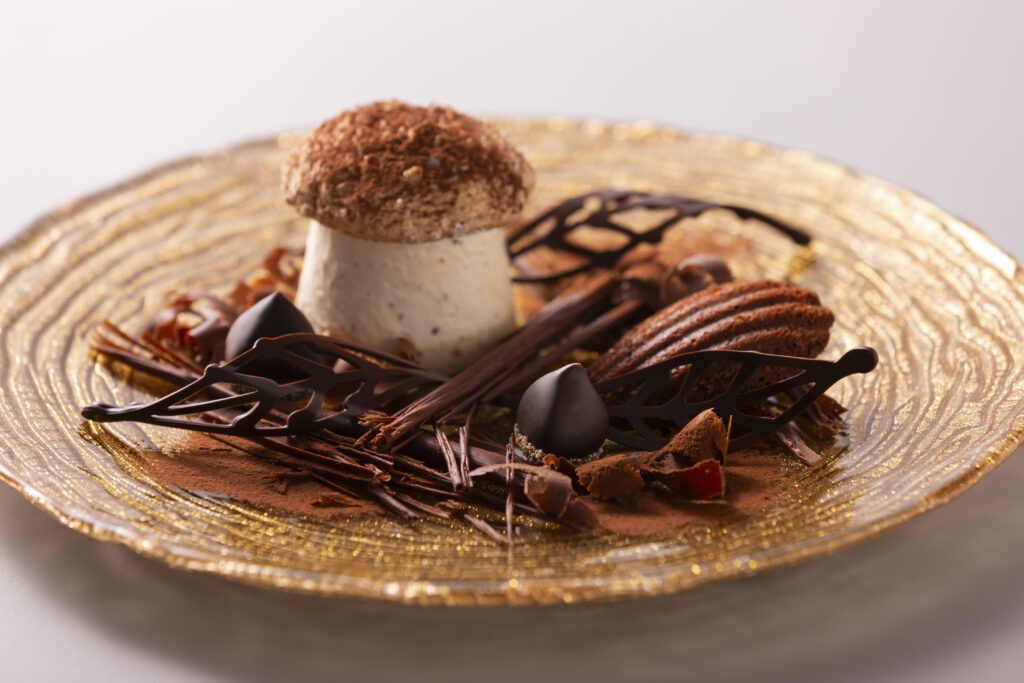しっとりとしたマドレーヌショコラや、栗や木の葉をかたどった繊細なチョコレート細工をあしらい、秋の訪れを感じさせる華やかなプレートをご用意しております。