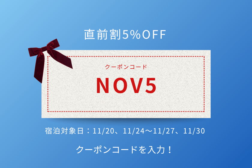 期間限定で表示価格より更に【5%OFF】でご宿泊可能な特別クーポンをご用意しました!