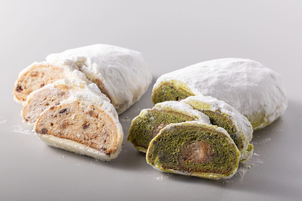 宇治抹茶の香り豊かな生地に丹波黒大豆を練り込み、栗風味のマジパンを巻き込んだ「和」のシュトーレン。