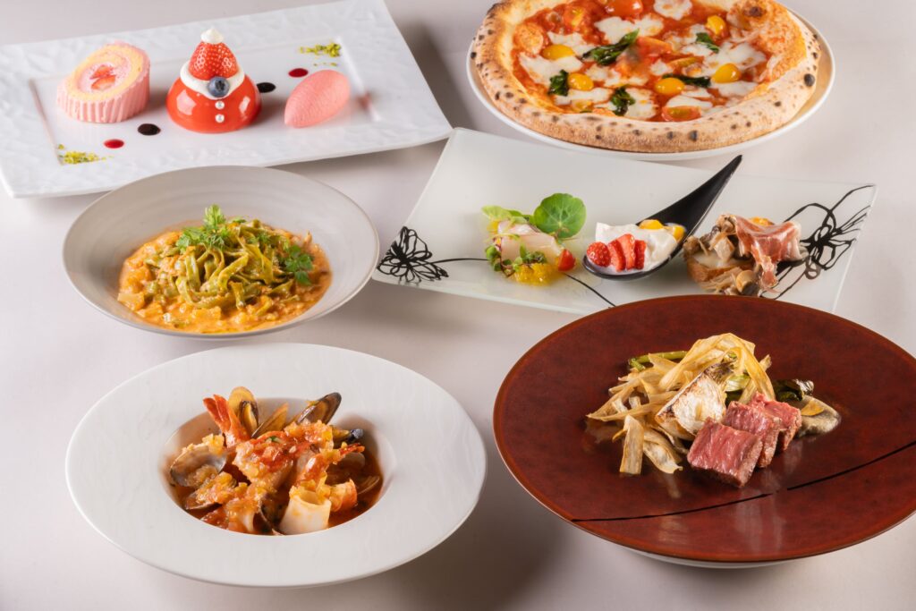 前菜盛り合わせ/蟹のトマトクリームパスタ(ほうれん草のタリアテッレ)/マルゲリータエクストラ/クリスマスドルチェ