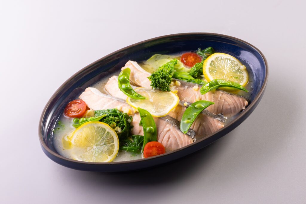 サーモンと春野菜の白ワイン蒸し 瀬戸内レモン風味